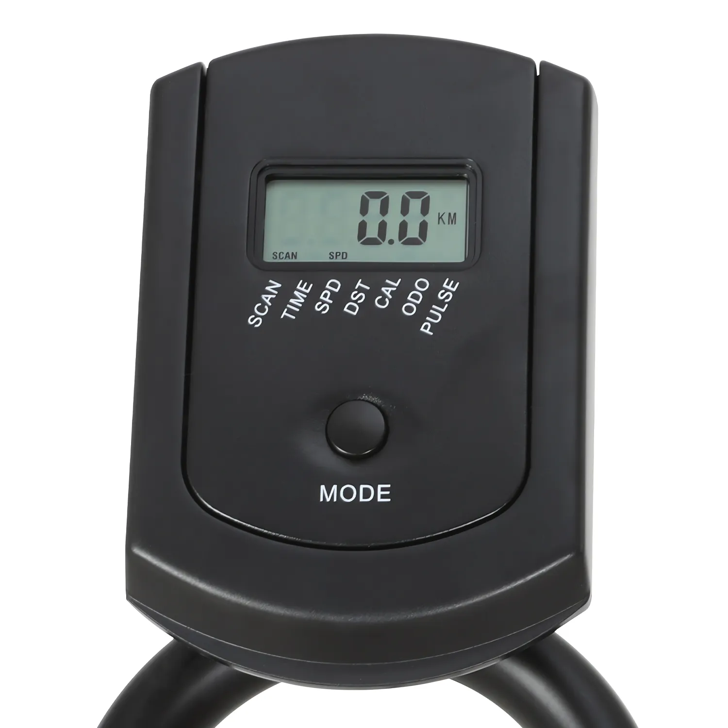 La estructura de acero robusto y el manillar recubierto de NBR y PVC proporcionan estabilidad y durabilidad, mientras que el asiento acolchado y ajustable, fabricado con espuma EPE y PVC, ofrece comodidad durante el entrenamiento. Este modelo también incluye un sensor de pulso para monitorizar tu frecuencia cardíaca y un monitor multifunción que registra velocidad, distancia, tiempo, calorías, odómetro y pulso, permitiéndote un seguimiento detallado de tu progreso.