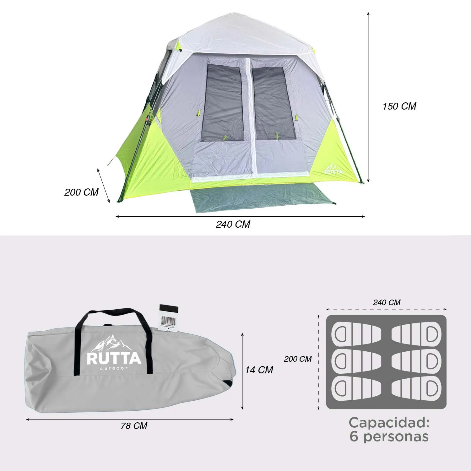 La QuickCamp 6P te permite aprovechar mejor el tiempo en el camping gracias a su montaje instantáneo, perfecto para escapadas de fin de semana, viajes en auto, playa, lago o montaña. Su revestimiento PU3000 mm ofrece un nivel de protección confiable en lluvias intensas y noches húmedas, mientras la mosquitera ayuda a mantener el interior protegido de insectos. El espacio está pensado para seis personas, brindando lugar para descansar y organizar equipaje básico sin perder comodidad. La combinación de fibra de vidrio y acero en las varillas entrega una estructura firme frente al viento, sin sumar demasiado peso al momento de transportar. Es una excelente alternativa para quienes quieren una carpa fácil de usar, con buen resguardo climático y armado rápido. La carpa instantánea QuickCamp 6 personas reúne apertura rápida, protección PU3000 mm, ventilación con mosquitera y estructura estable, convirtiéndose en una gran compañera para disfrutar del camping en grupo sin complicaciones de montaje.