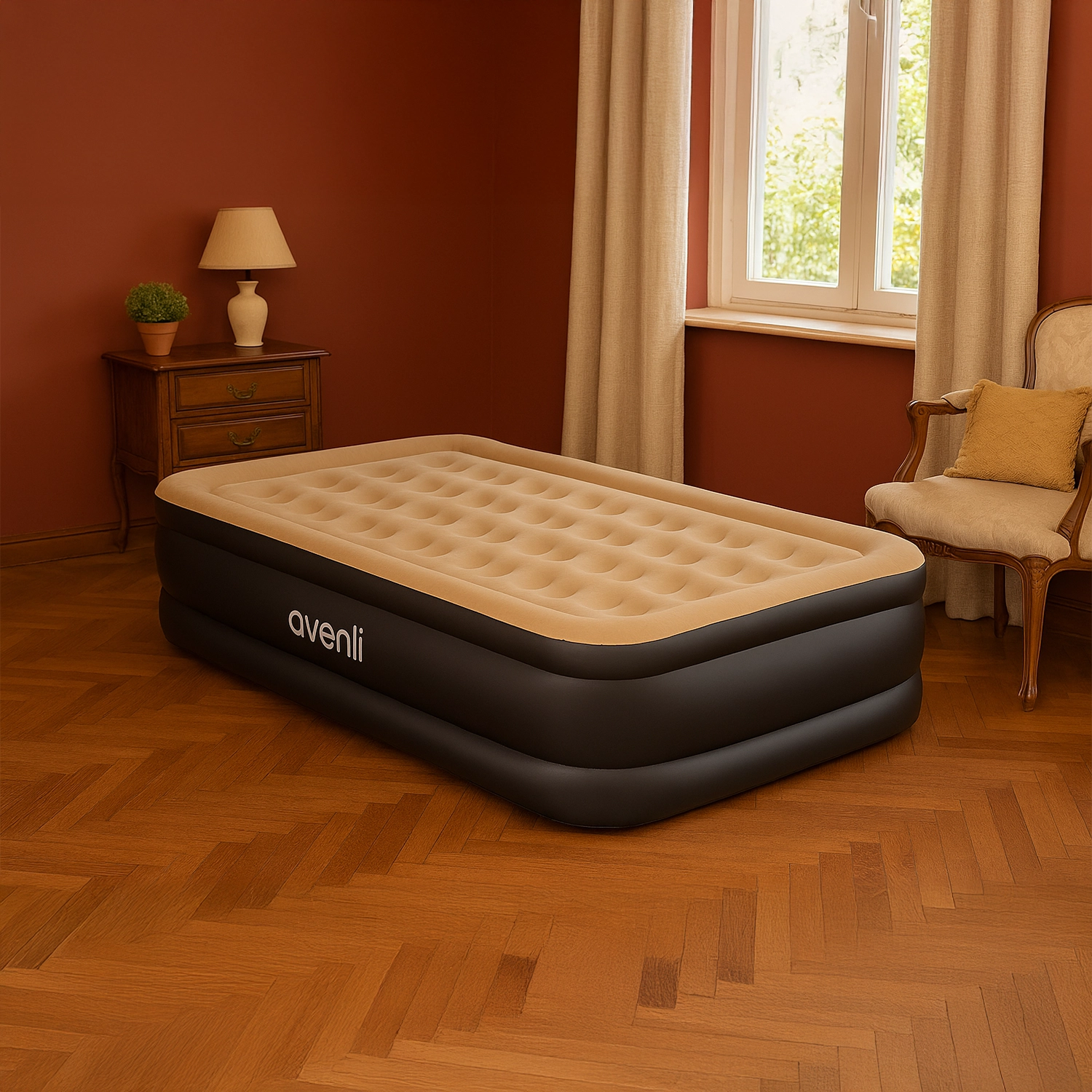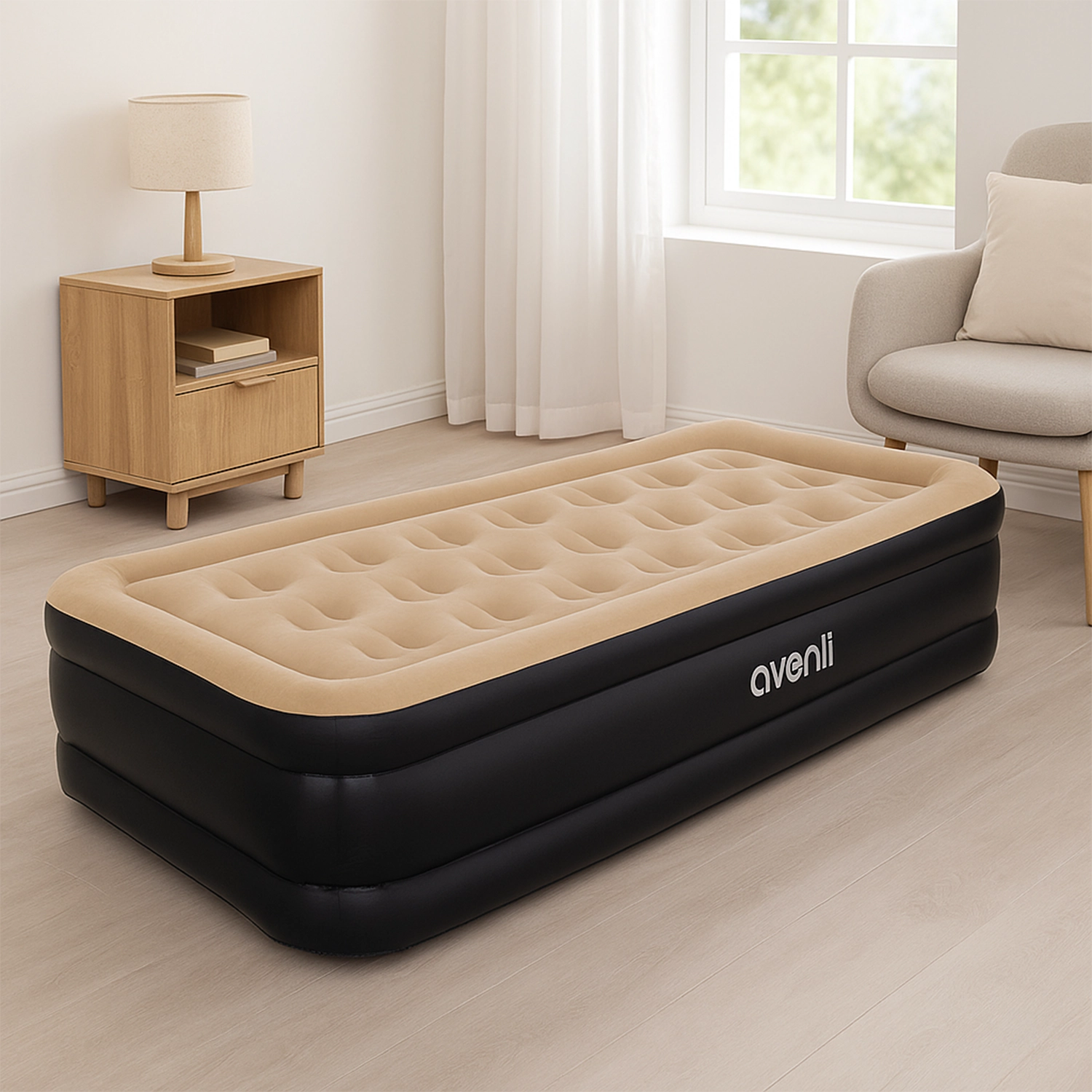 El Colchón Inflable Eléctrico Individual 1 Plaza es la solución perfecta para descansar con comodidad en cualquier lugar. Gracias a su sistema de inflado eléctrico integrado, puedes tenerlo listo en pocos minutos, ya sea conectado a corriente de 220-240 V (UE) o 110-120 V (EE.UU.).