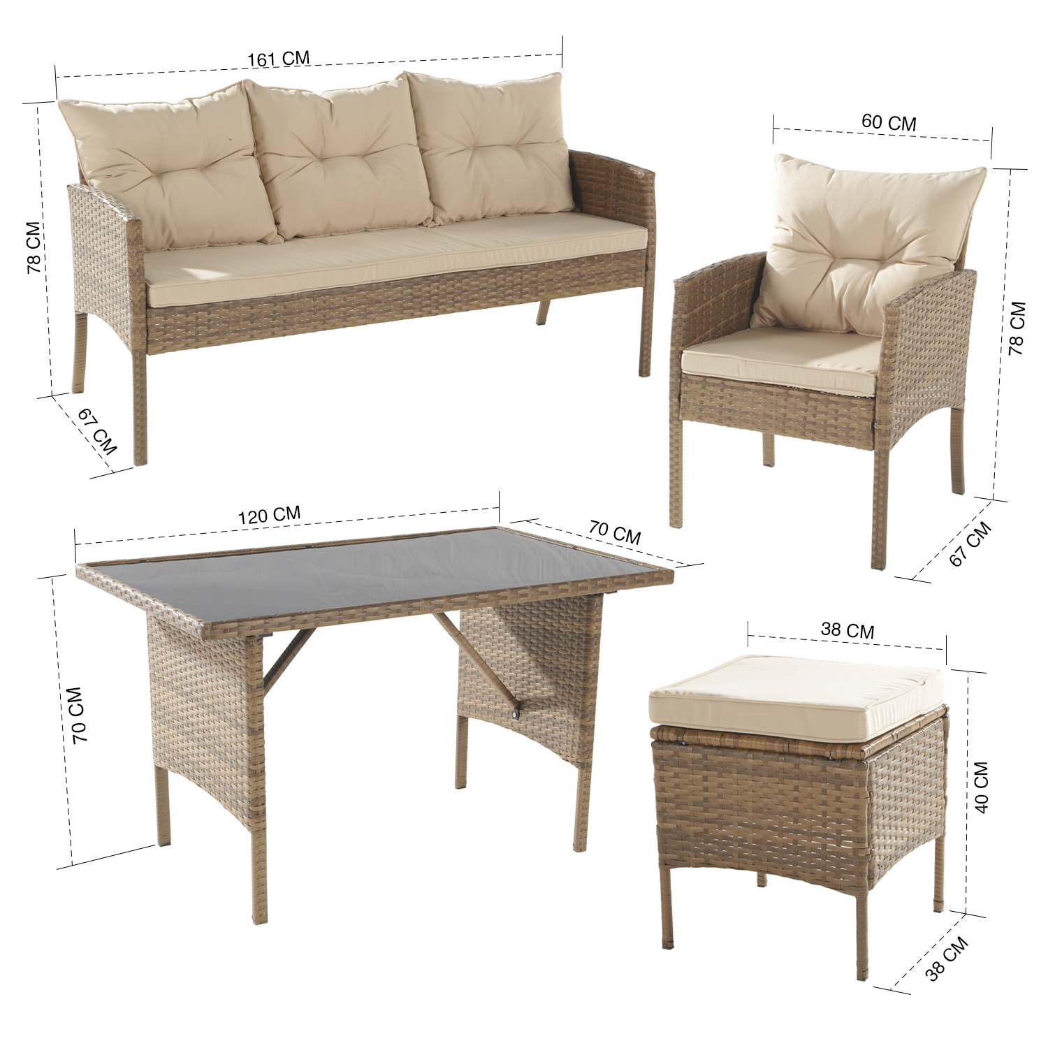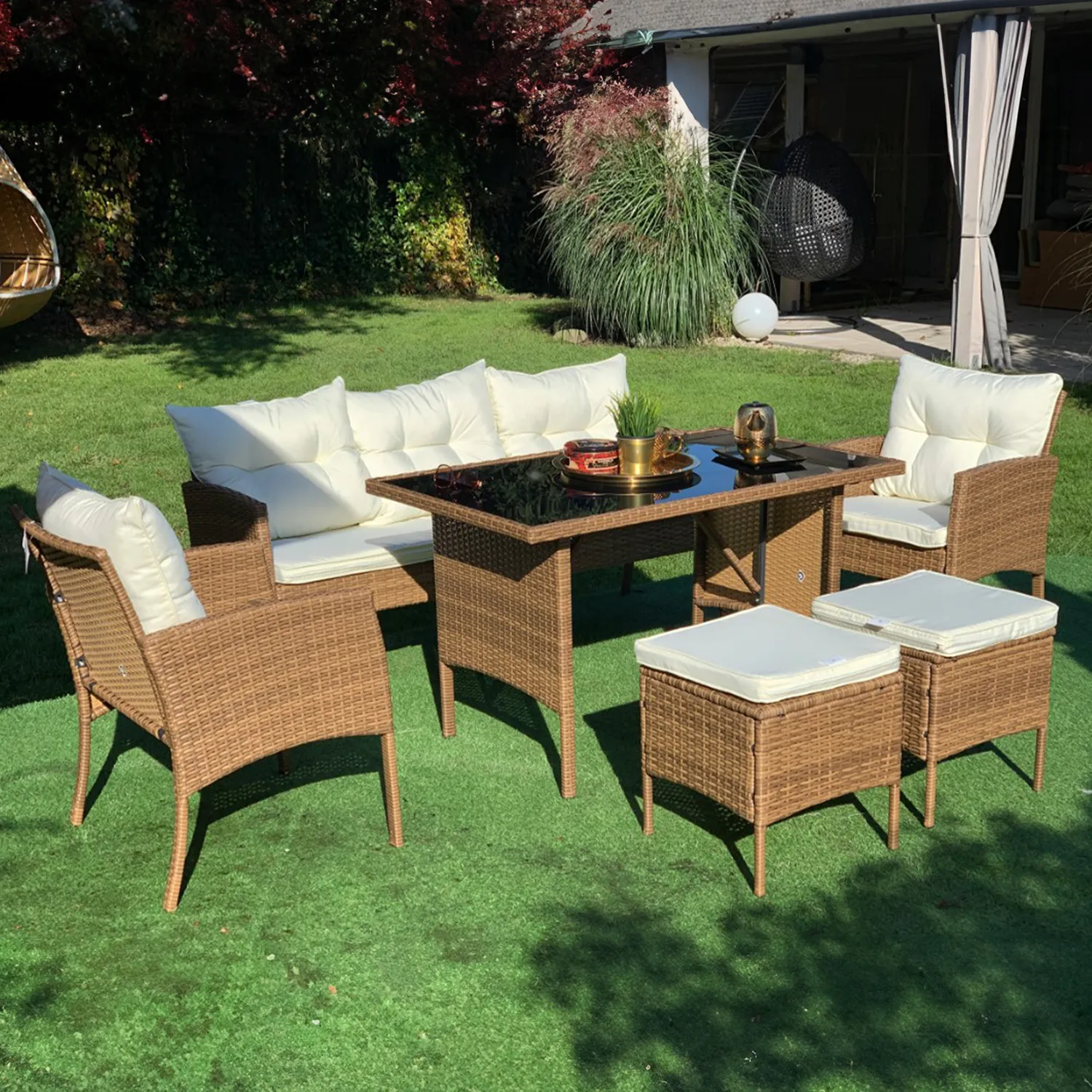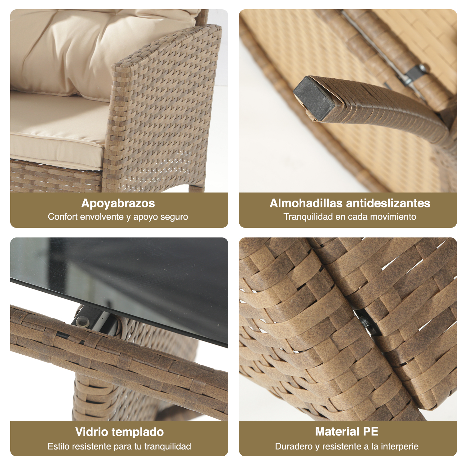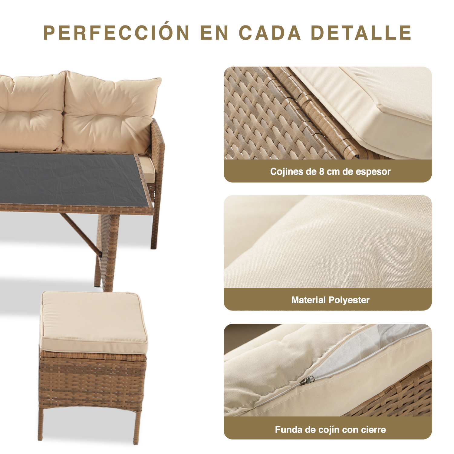 Ideal para reuniones familiares, cenas al aire libre o simplemente para relajarse con una buena taza de café. Los cómodos cojines, combinados con el amplio espacio de la mesa, ofrecen una experiencia única de confort. Además, su diseño elegante y moderno se adapta a cualquier decoración exterior, aportando un toque de sofisticación.