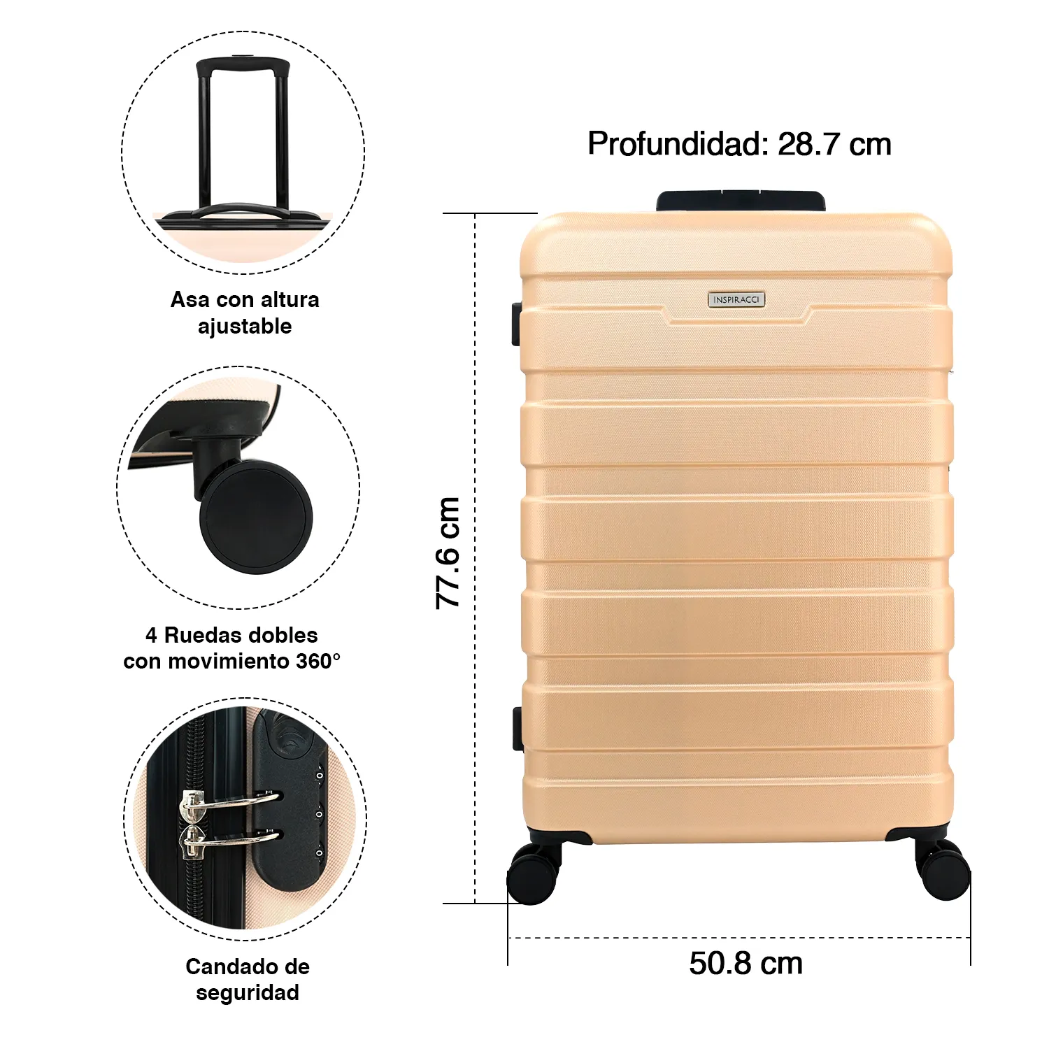 La maleta rígida Inspiracci Danubio L en color champagne es la compañera perfecta para tus viajes más largos. Con una capacidad de 23 kg, esta maleta ofrece un amplio espacio para llevar todas tus pertenencias de forma organizada y segura. Fabricada en material ABS, es resistente y duradera, garantizando la protección de tus artículos durante todo el trayecto. Su interior forrado en poliéster cuenta con divisiones internas y una banda ajustable para mantener todo en su lugar, sin importar lo que lleves.