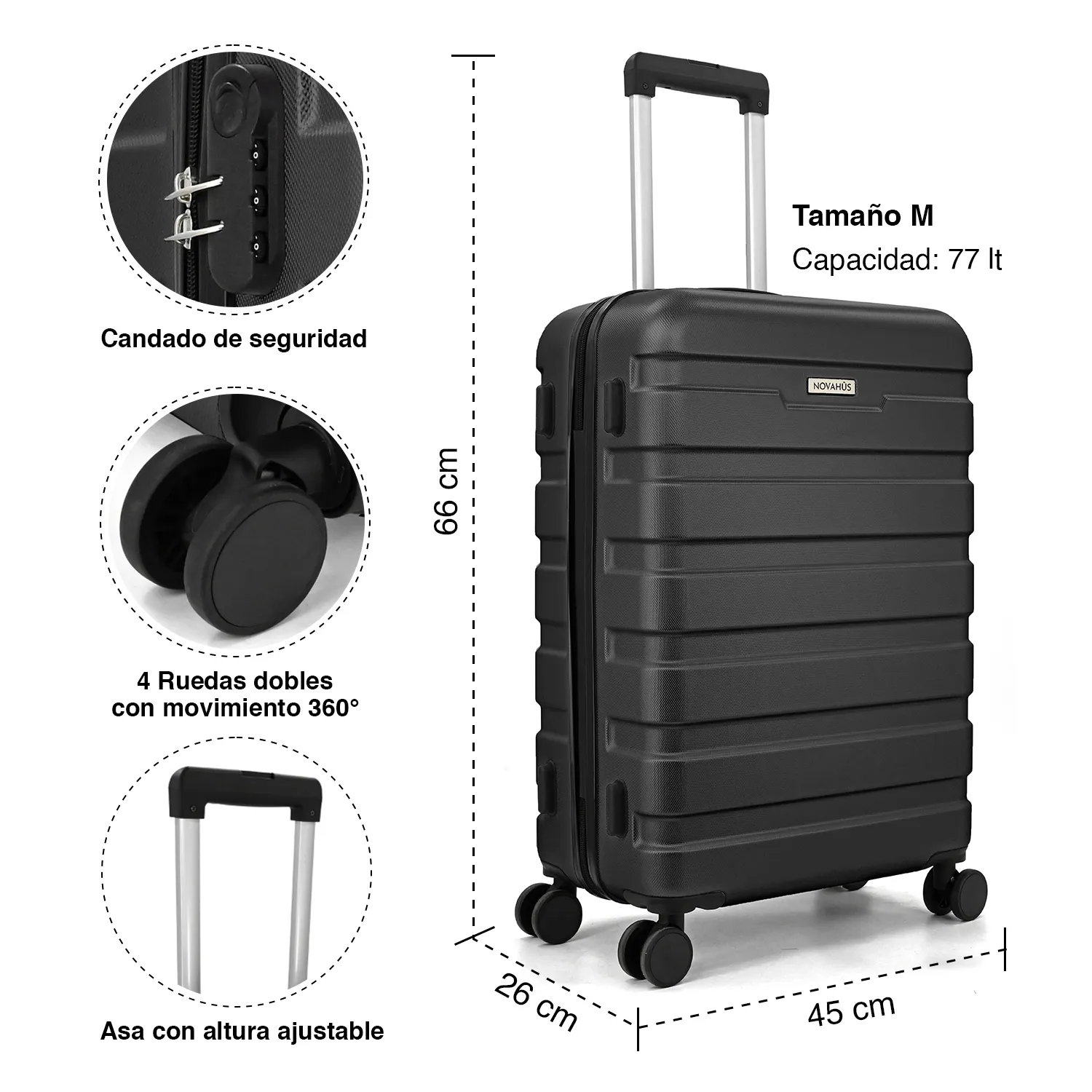 ¡Viajar con tranquilidad y estilo nunca fue tan fácil! La maleta rígida Danubio M 18 kg negra es la aliada perfecta...