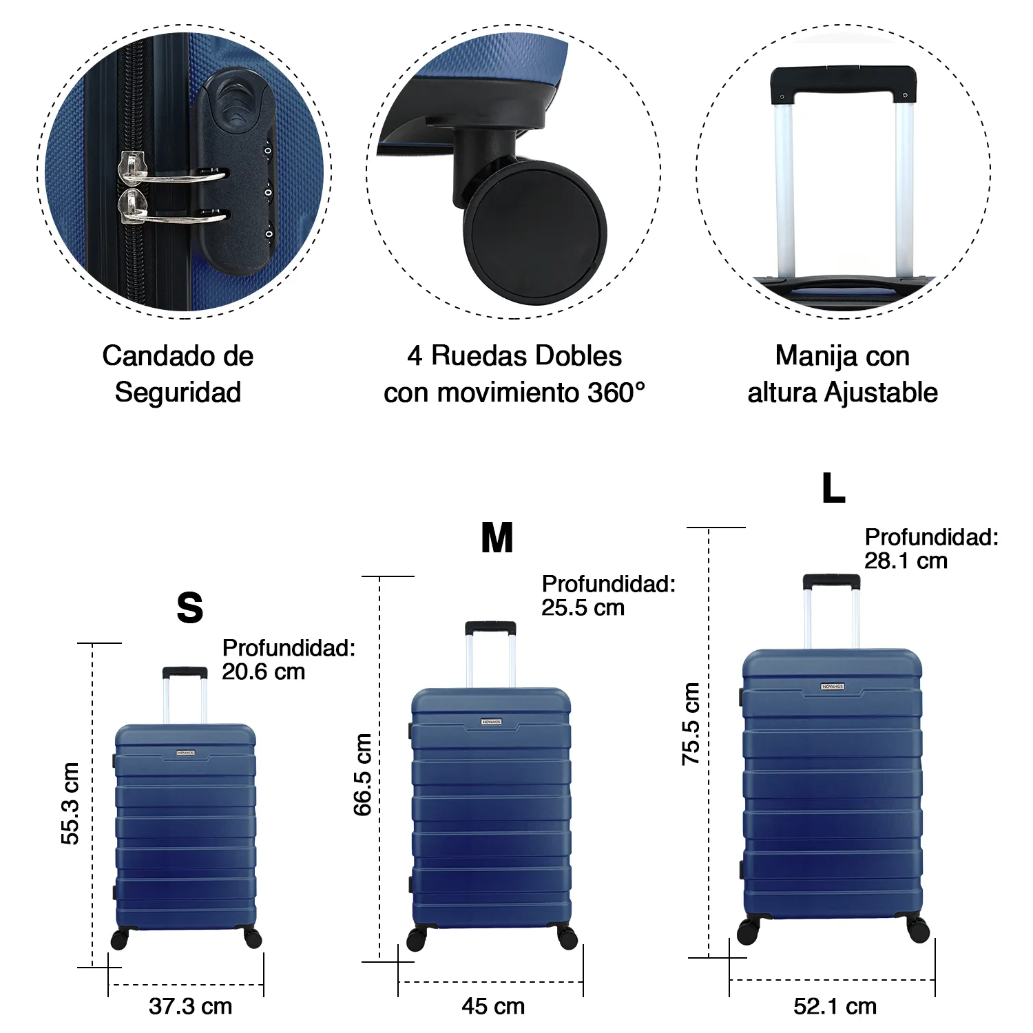 La maleta tamaño S ofrece 45 litros de capacidad, perfecta como equipaje de cabina; la M cuenta con 77 litros para viajes de algunos días, y la L te brinda hasta 116 litros para escapadas prolongadas o viajes familiares. Su diseño elegante en azul combina funcionalidad y estética, convirtiéndolas en el aliado perfecto para todo tipo de viajeros.