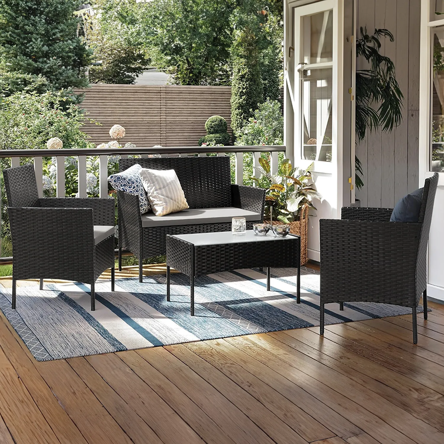 Este set incluye un sofá de dos plazas, dos sillas individuales y una mesa de centro. Todos los elementos están construidos con una robusta estructura de acero y un acabado en PE que no solo es duradero, sino también resistente a las condiciones climáticas, asegurando una larga vida útil. Los cojines, fabricados en poliéster de alta calidad, proporcionan una comodidad excepcional y son fáciles de limpiar.