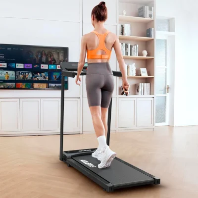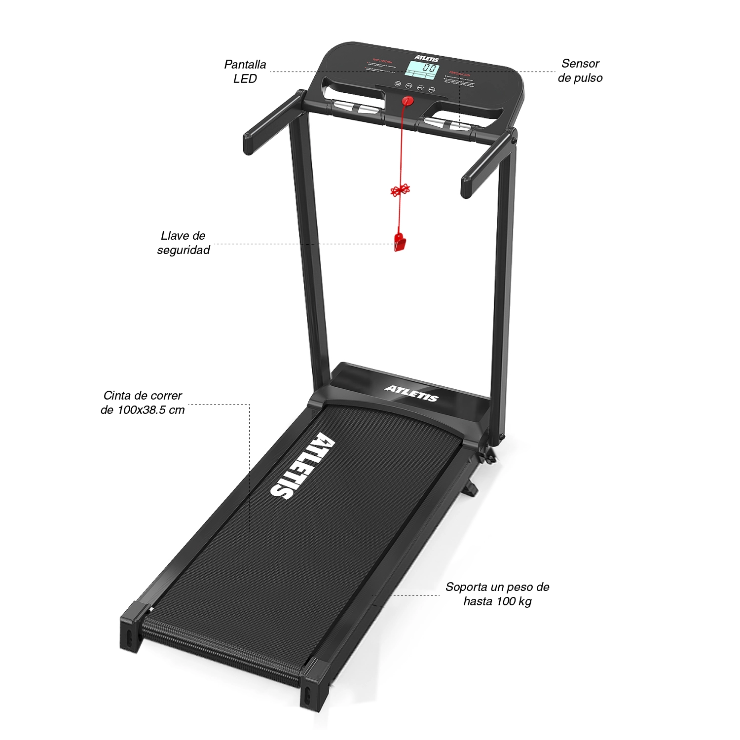 Fabricada con estructura de acero, madera y PVC, soporta hasta 100 kg de usuario y cuenta con un sistema de amortiguación que protege las articulaciones en cada paso. Su diseño plegable con ruedas de transporte facilita el guardado y traslado, optimizando el espacio en tu hogar.