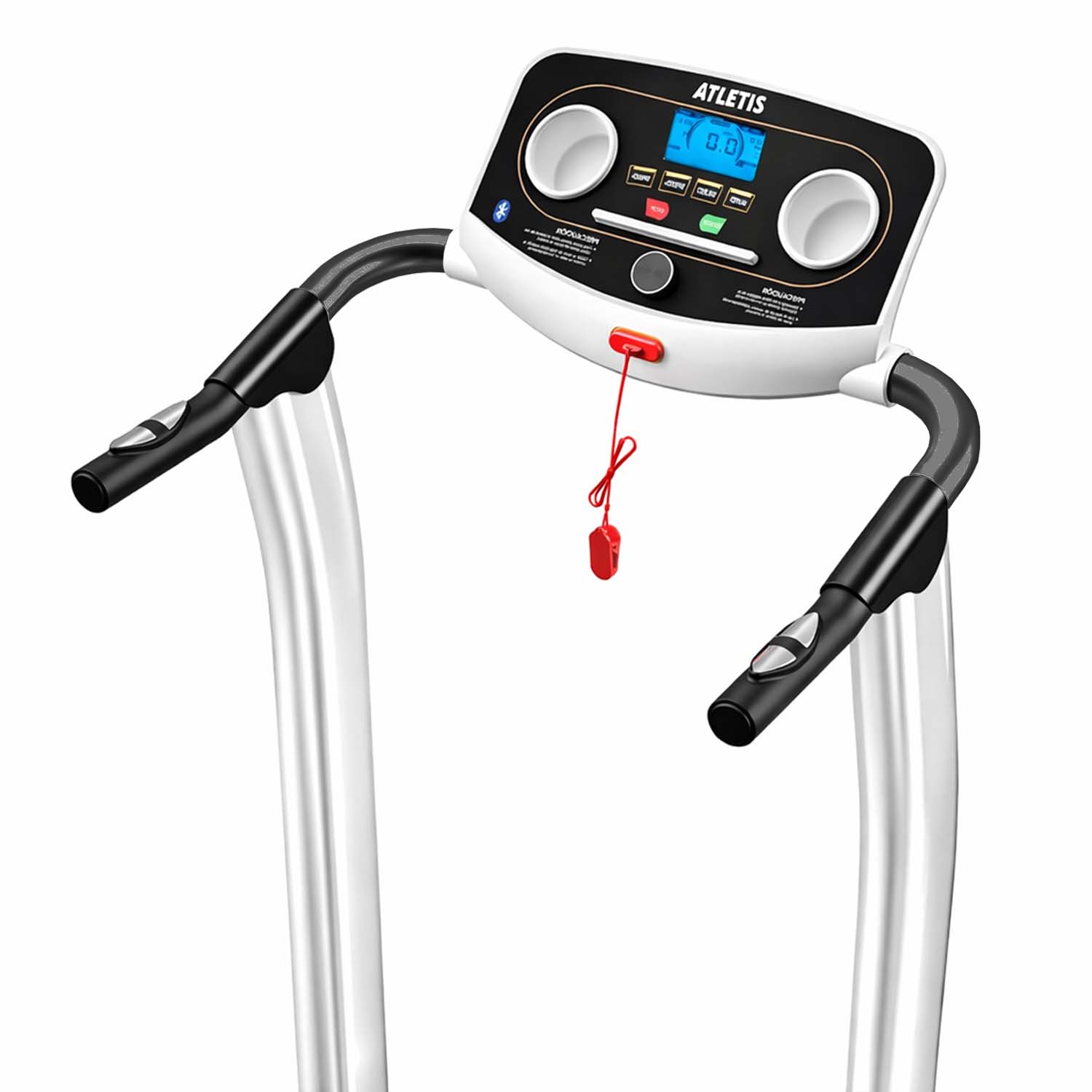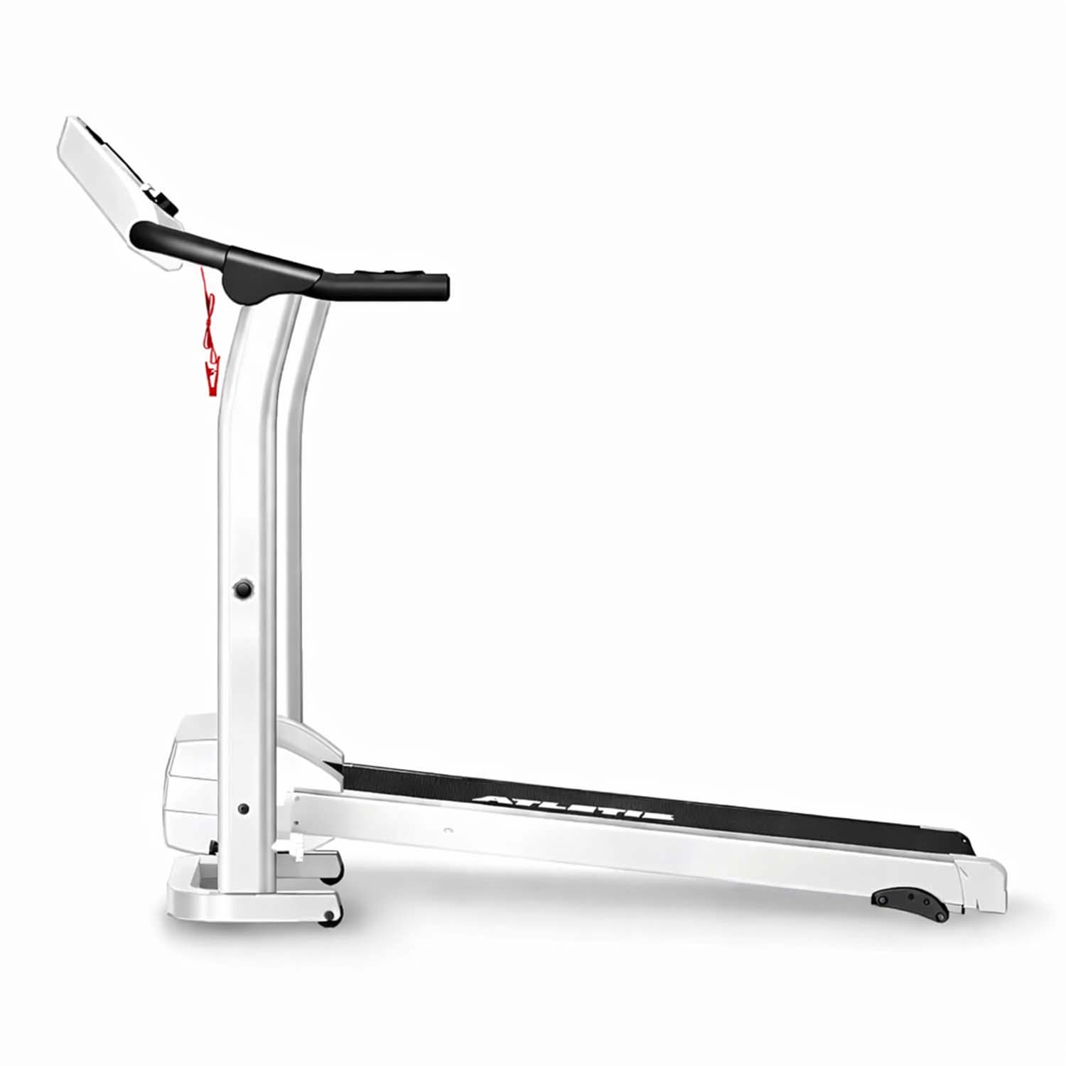 La Trotadora M201 Blanca combina velocidad, inclinación por grados, Bluetooth y monitoreo de pulso en una trotadora plegable para entrenar en casa con variedad y control.