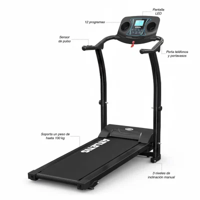 Incluye 12 programas predefinidos, sistema de amortiguación que protege las articulaciones y funciones de seguridad como llave de emergencia y parada automática. Todo en un diseño plegable con ruedas que facilita su traslado y almacenamiento.
