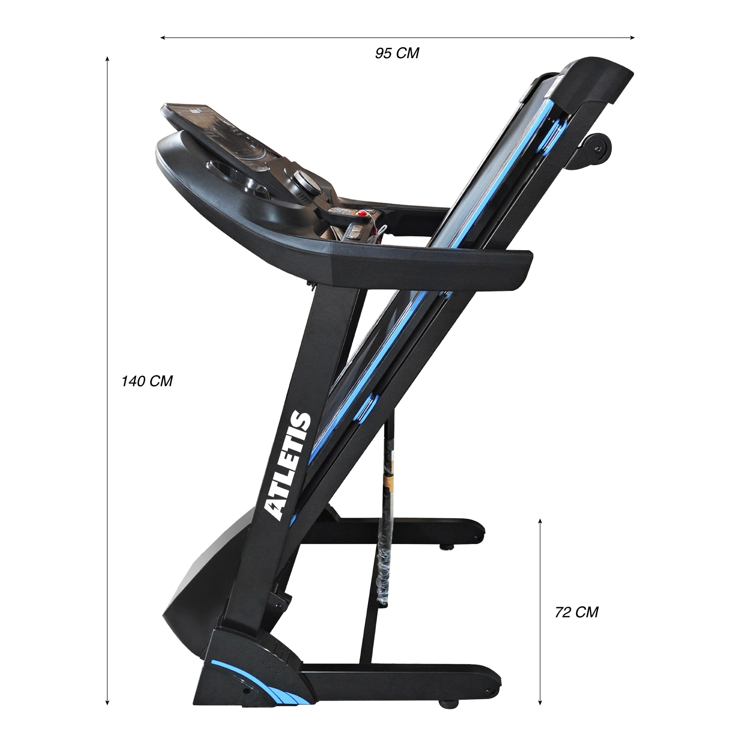 Su estructura robusta de hierro y plástico soporta hasta 120 kg e incorpora 15 niveles de inclinación automática para variar la intensidad y simular pendientes. La superficie de carrera de 45 x 126 cm brinda seguridad y comodidad, mientras que su diseño plegable con ruedas facilita el almacenamiento en espacios reducidos.